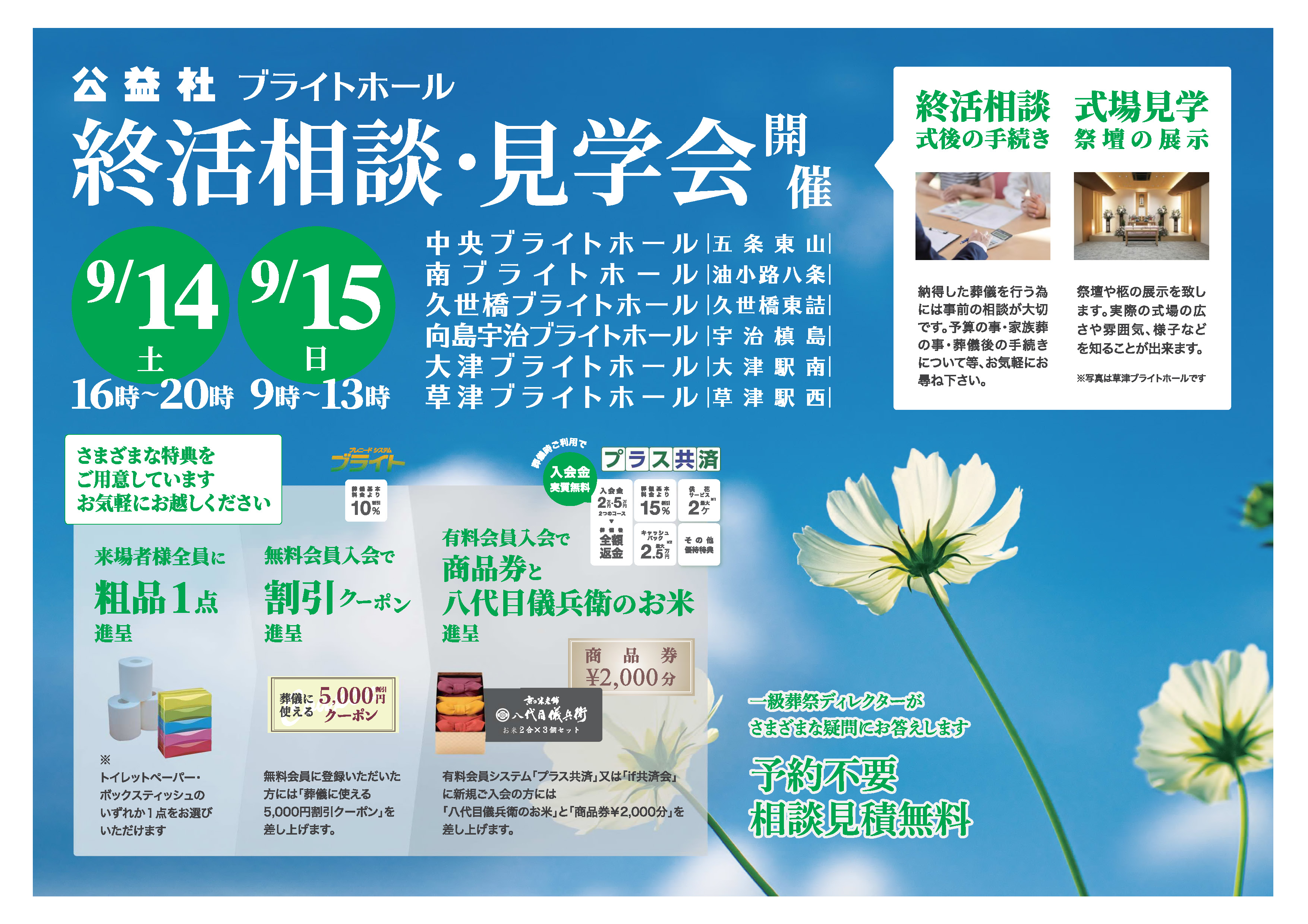 9月14日(土)、15日(日)「終活相談・見学会」を下記の6ホールで開催します。 1級葬祭ディレクターが葬儀、終活のことや葬儀後の手続きなど皆さまのご質問、ご相談にお答えいたします。 ホール内の式場では祭壇やお柩の展示を行ないますので、式場の雰囲気や様子を知っていただけます。 ご予約は不要です。 ご都合のよいお時間にお気軽にご来場ください。